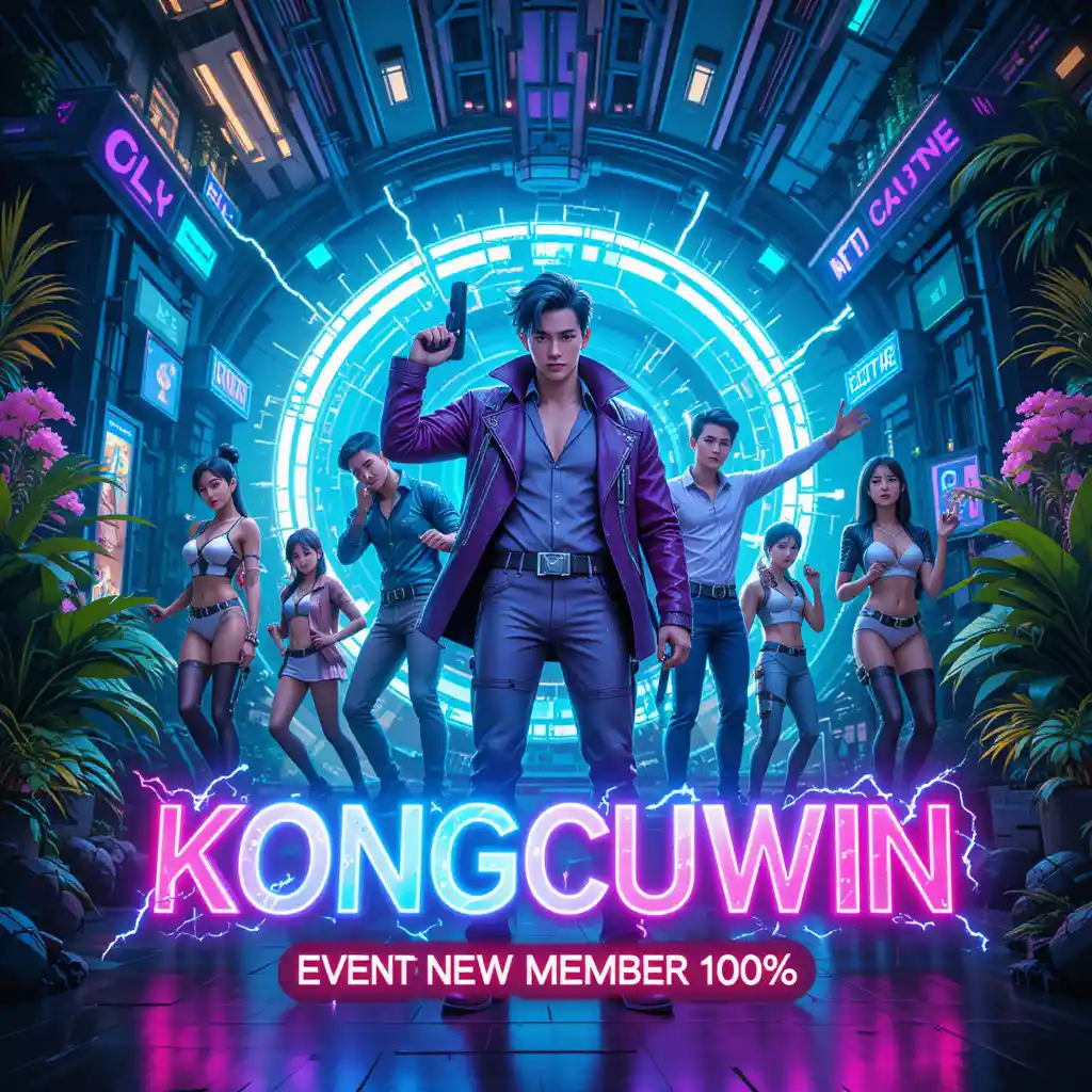 Di bagian bawah gambar, terpampang dengan jelas tulisan “KONGCUWIN” dalam huruf kapital berwarna neon biru dan ungu, dikelilingi efek petir yang menyala. Ini bukan hanya nama brand atau permainan—ini adalah identitas. Di bawahnya, terdapat penawaran khusus: “EVENT NEW MEMBER 100%”, yang menandakan bahwa ini adalah promosi menarik bagi siapa pun yang baru bergabung.