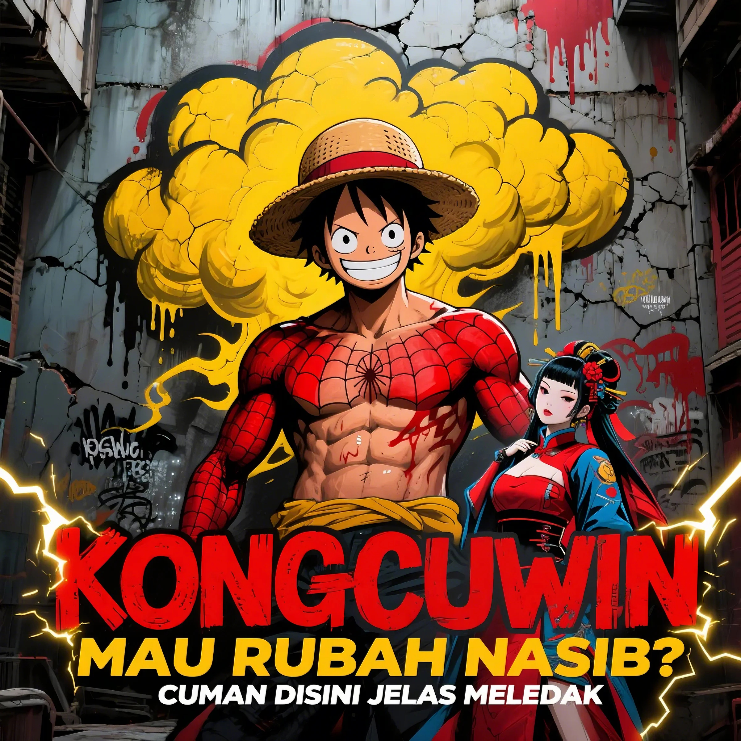 Gambar yang digunakan dalam kampanye KONGCUWIN sangat menarik perhatian. Menggabungkan karakter populer seperti Luffy dari One Piece dengan elemen superhero Spider-Man, lalu membalutnya dalam atmosfer mural jalanan yang penuh warna, menyampaikan pesan yang kuat: perubahan nasib tidak datang dari tempat steril — tapi dari keberanian dan aksi di tengah medan keras kehidupan.