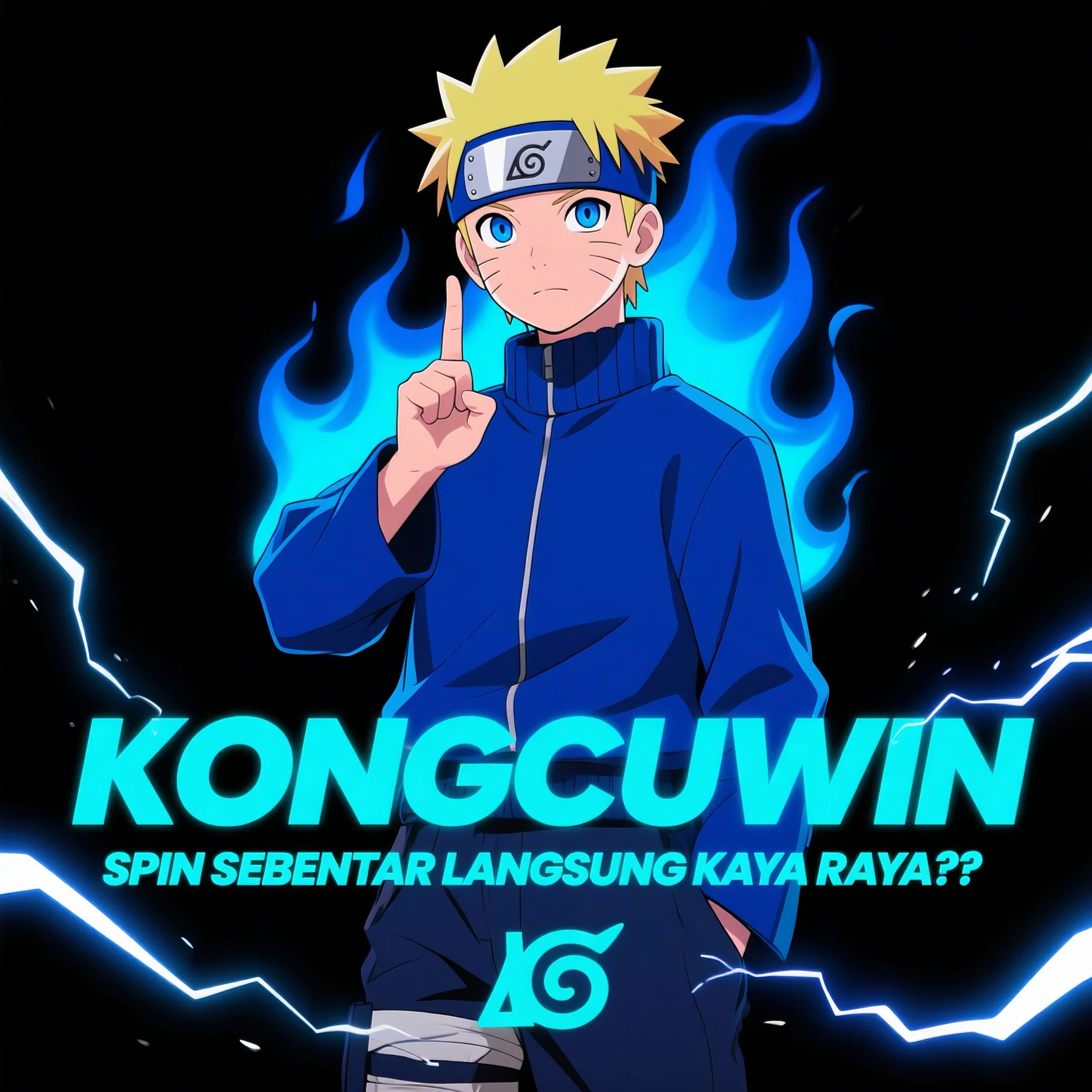 Visual branding yang mencolok—menggunakan karakter seperti ninja berambut pirang yang menyerupai ikon anime populer Naruto—membuat KONGCUWIN langsung menarik perhatian. Tak hanya itu, nuansa biru elektrik dan elemen petir dalam desain memberi kesan powerful dan penuh energi, seolah mempertegas pesan bahwa satu klik bisa mengubah nasib Anda.
