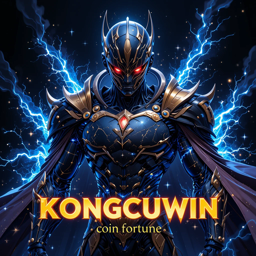 Gambar yang terpampang memperlihatkan sosok KONGCUWIN dalam bentuk teragungnya—seorang prajurit berzirah logam gelap kebiruan, dihiasi guratan emas yang berkilau seperti pecahan bintang. Pada dadanya, sebuah permata merah menyala, seolah-olah menjadi jantung energi yang menghidupi seluruh semesta. Matanya merah menyala membara, menembus realitas dan ilusi, seakan mampu melihat kebenaran terdalam dari jiwa setiap makhluk.