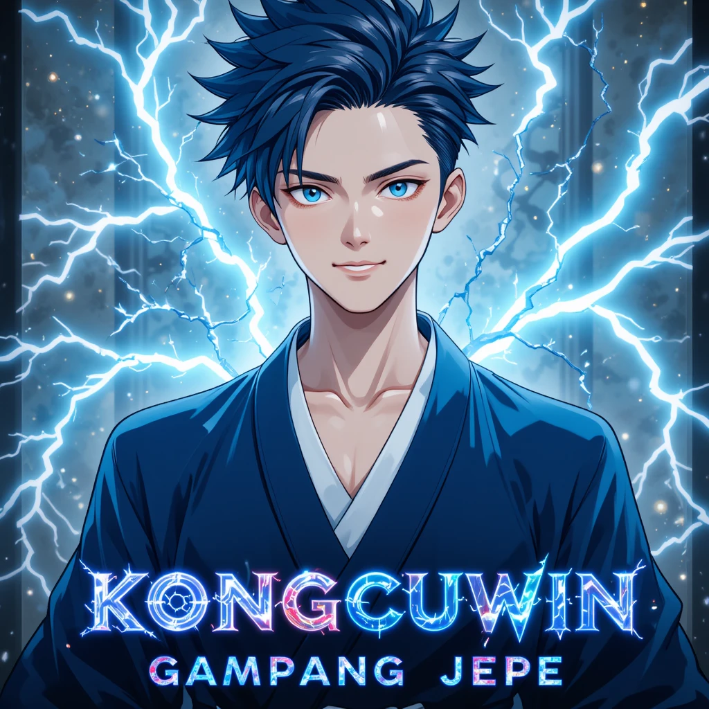 Gambar promosi KONGCUWIN menampilkan sosok pria muda dengan aura biru elektrik yang kuat. Elemen visual ini memiliki makna filosofis: