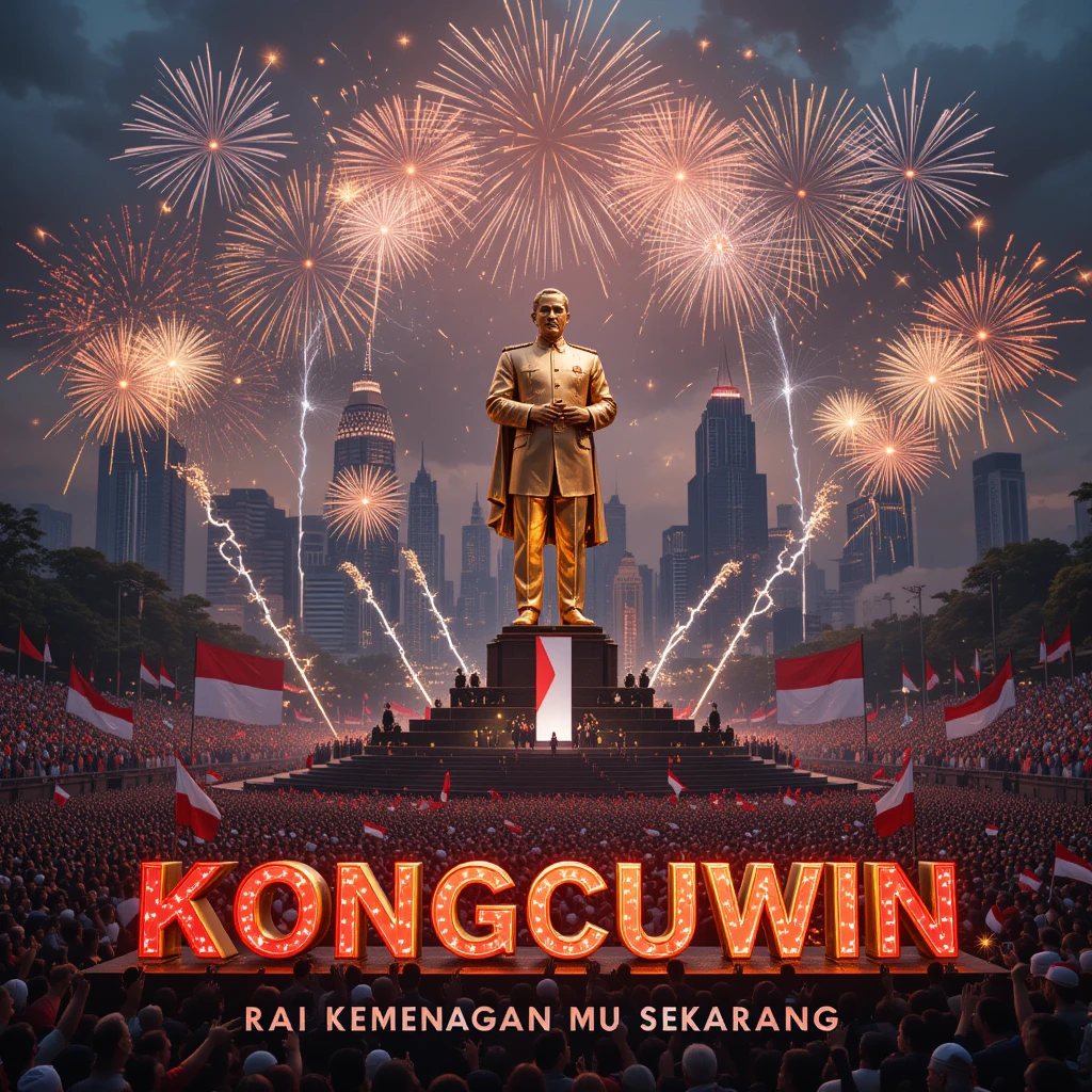 Gambar ikonik yang Anda tampilkan memperlihatkan patung emas pejuang di tengah alun-alun besar, diiringi pesta kembang api serta lautan bendera merah putih. Ini bukan sekadar ilustrasi—ini adalah perwujudan visual dari semangat KONGCUWIN: keberanian, kejayaan, dan persatuan.