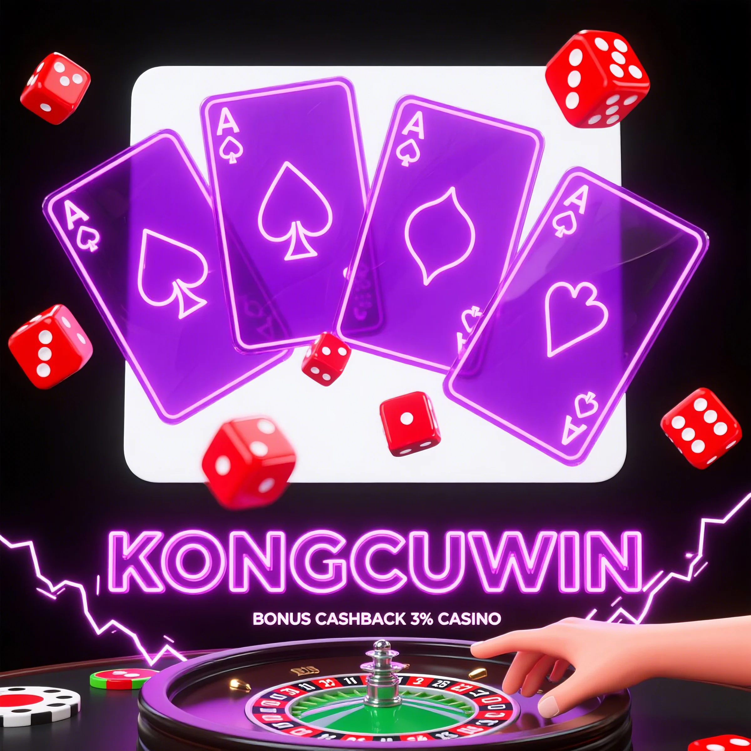 Dalam gambar tersebut, kita bisa melihat empat kartu As — simbol keberuntungan dalam dunia perjudian — serta dadu merah yang melayang bebas di sekitar layar. Ini melambangkan elemen peluang dan keseruan yang menjadi inti dari pengalaman bermain di KONGCUWIN.